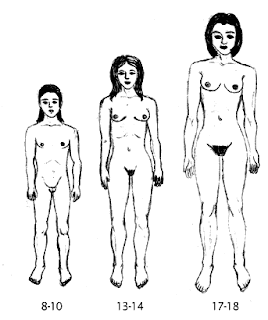 Hair begins to appear in the pubic area and later it grows on the face and underarms. During this time, a male's voice also deepens.